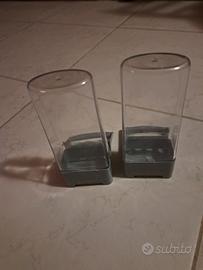 In plastica trasparente e base grigia ed è valido per qualsiasi gabbia con barre orizzontali con una distanza di 1,5 cm tra loro. Dotati di trespolo per fare in modo che l'uccello possa riposare le gambe mentre mangia o beve.