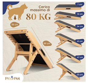 ciao vendo 2 rampe per cani pieghevoli e regolabili 18-53 cm per letto, divano ed auto. prodotto nuovo mai usato, sigillato in confezione originale. sono realizzati in legno di betulla con rivestimento antiscivolo. caratteristiche: LEGNO DI BETULLA MASSELLO: scala per cani realizzata in legno di betulla per mobili, ben più forte della maggior parte dei legnami, quali il pino. Può trasportare cani grandi e pesanti. Si può scegliere tra 5 bellissimi colori per abbinarla alla propria abitazione. ALTEZZA REGOLABILE: 53, 47, 41, 34 e 18 cm. L'altezza può essere adattata a un divano, un letto o un'auto. La scaletta per cani si piega piatta fino a soli 7 cm di altezza per un facile stoccaggio/trasporto. PRESA ANTISCIVOLO IN GOMMA: la superficie è realizzata in gomma, il che offre un'incredibile presa, impedisce al tuo animale da compagnia di scivolare ed è meglio di qualunque alternativa con moquette! CON IMPUGNATURA PER IL TRASPORTO: la nostra scala per cani viene fornita del tutto assemblata, pertanto non occorrono degli attrezzi. L’impugnatura facilita il trasportarla. Dimensioni della rampa per cani piegata: Lunghezza: 89 cm x Larghezza: 36 cm x Altezza: 7 cm. Altezza massima: 53 cm. prezzo amazon: - nero = 110 - legno = 100 prezzo mio 60 ritiro a mano provincia di Modena o Rimini