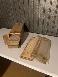 3 melari con telaini costruiti, non sono perfetti ma buoni per partire con il primo miele Telaini con cera da costruire e escludiregina di plastica tagliati in 58 pezzi per fare blocco di covata per 29 telai da melario