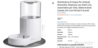 Vendo distributore di acqua per animali domestici 2,5L prezzo nuovo 33 euro. No spedizione, no perditempo, no a prezzi assurdi, ritiro in zona Castenaso. Offro e richiedo massima serietà.