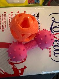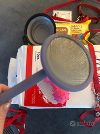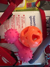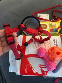 Guinzaglio rosso, pettorina, trappetini igienici, 2 giochi, medaglietta da incidere, salviette umide all’argan, spazzola, dog bag e collare, ciotola da viaggio.