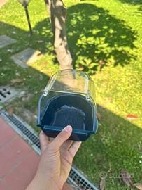 Piscinetta per uccellini da attaccare alla gabbia con antiscivolo sul fondo di colore blu con cupola trasparente.