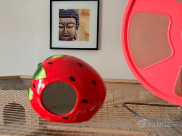 Vendo vari oggetti per criceto. - casa in ceramica fragola 5 euro - ruota 28 cm , 15 euro - ponte + scaletta ( totale 8 euro).