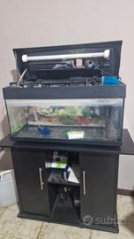 vendo 2 acquari o insieme o separati con pesci rossi e pesci pulitori acquario più piccolo e circa 50 litri con pesci rossi prezzo 80 € invece acquario più grande con mobile e pesci rossi 150€