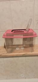 Piccola vasca in plexiglass trasparente con coperchio rosa staccabile munito di feritoie per aerazione, di apertura superiore e di maniglia per il trasporto.