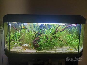 vendo fantastico acquario 200 litri con tantissimi accessori per la cura dello stesso. Oltre l'acquario verrà fornito il mobiletto sottostante con ante scorrevoli, pinza lunga, kit pulizia, la sabbia inerte bianca già all'interno che verrà lavata, valigetta test della Sera professionale (da sola costa 90€) con test utilizzati pochissimo, sistema Co2 fai da te, misuratore elettronico di PH e conducibilità a penna, attrezzo per livellare la sabbia, radice taglia grande in legno visibile anche in foto, materiale filtrante, filtro interno, strip LED, areatore, riscaldatore, attivatore batterico, prodotto per eliminare le alghe, esha 202 disinfettante e molti altri accessori. verrà venduto svuotato e pulito. scambio anche con canarini e pappagalli