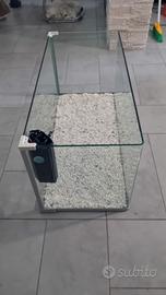 l'acquario e munito di tappetino termico azzurro sul fondo ed è completo di filtro riscaldatore e giaietto.