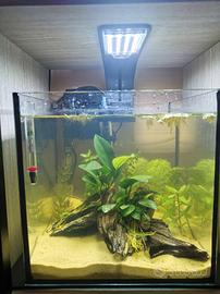 Vendo acquario 20 litri, ottimo per Betta o caridine. misure: 24 cm x 24 cm x 24 cm. Completo di tutto: filtro a zainetto, luce, termometro, riscaldatore, fondo sabbioso e legni.