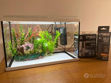 Vendo acquario 20l per pesci tropicali completo di pompa e riscaldatore come nuovo usato per una sola settimana per errato acquisto, insieme anche delle piante finte e dei sassi pronto all’uso