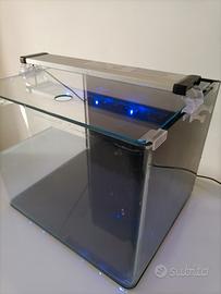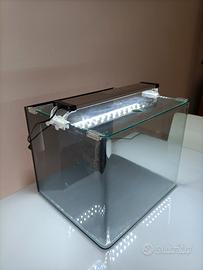 vendo acquario 20/ 25 litri con scomparto per il filtro e luce led l'acquario come da foto presenta una piccola scheggiatura ,non si nota nemmeno