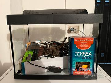 Acquario tetra da 30lt perfetto e completo di riscaldatore, mangiatoia automatica, presa temporizzatore, luce led originale e luce led foto stimolante, roccia e radice in legno naturale. Manca il filtro. Tutto in perfette condizioni.