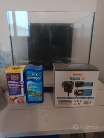 Acquario 30x30x30 della creas usato pochissimo. Con l'acquario cedo anche substrato(ghiaia) sufficiente per coprire tutto il fondo dell' acquario almeno per 2-3 centimetri circa, test per il pH come nuovo con dentro circa 20 o più Stick per il test, filtro Niagara funzionante e il condizionatore d'acqua.