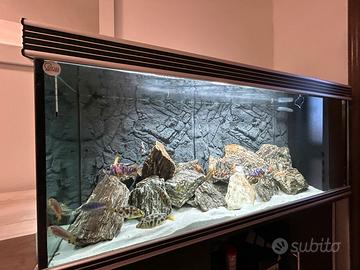 Vendo acquario 450 litri (NO PESCI). Misure 150x50x60. Compreso nel prezzo ( mobile, 30kg di sabbia, 40 kg di rocce, scatola filtro interno fatta su misura, riscaldatore, pompa di filtraggio da 3700 litri/h regolabile e luce led. Prezzo leggermente trattabile