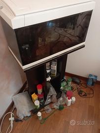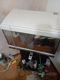 vendo acquario da 50 litri più mobiletto , più svariati accessori e mangimi, DA PULIRE di fino una prima pulita già fatta e bisogna cambiare le ventose dietro poi ha tutto pompa , areatore ,riscaldatore 2, ulteriori pietre per il fondale mangimi sia in granuli che a fiocchi mangimi per vegetariani stick per la regolazione dell'acqua fertilizzanti sia liquidi che solidi per piante vere, grotta in pietra, c'è tutto, solo gli accessori supera già la cifra richiesta, ritiro in