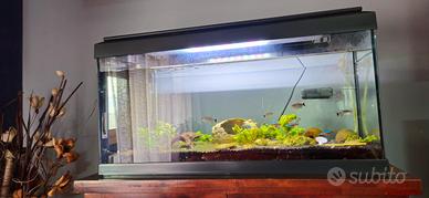 Acquario 70 l (80×30 h 40) completo di pompa appena acquistata. Vendo cosi come in foto completo di accessori e pesci. No spedizione per ovvi motivi. Il coperchio non si mantiene più aperto da solo causa rottura di ganci Prezzo trattabile.