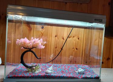 Acquario Amtra da 40 litri, completo di illuminazione LED (3 intensità diverse di luce). In ottime condizioni, è perfettamente funzionale; presenta solo alcuni graffi sul coperchio (come si può vedere dalla foto). Lo vendo completo di sabbia rossa/blu, decorazione albero rosa e due conchiglie. Misure totali di ingombro: 50 cm× 40 cm x 25 cm.