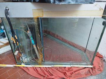 Ciao a tutti. Vendo questo bell'acquario angolare artigianale. Con un'altezza di circa 60 cm e i lati di oltre 80 cm, offre una notevole capacità. E' dotato di impianto elettrico e mobiletto di supporto. Includo anche sabbia e allestimenti interni.