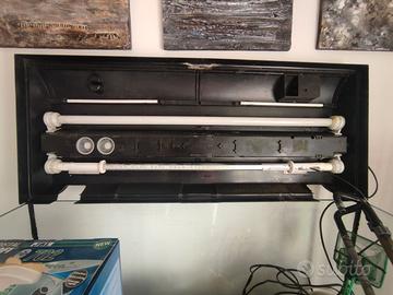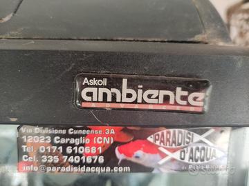 Vendo acquario Askoll Ambiente da 160 l (100 x 40 x 40) cm con mobile, filtro esterno green line e702, n. 2 riscaldatori da 200 W ( Askoll lo tenevo come secondo riscaldatore essendo più datato). Arredi vari, tubo per sifone, mangiatoia, libri, ecc. In buono stato di conservazione presenta segni di usura, ma attivo fino a aprile 2026. Gia' dotato di un tubo a luce LED per acquario. Tubo fluorescente da sostituire (utile se si vuole piantumare). Ritiro sul posto dopo visione.