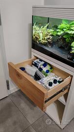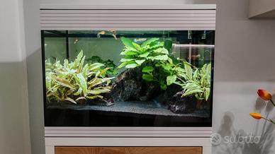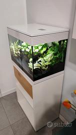 vendo acquario che ancora sta funzionando compreso di acquario misure L 56xP36xH43,5 cm , con termoriscaldatore e gruppo pompa nuova cambiata un mese fa, e filtraggio. Allestimento comprende n°3 pietre ,ghiaino piante vere e pesci,di cui 3 cardinali 3 gruppi maschi e 3 gruppi femmine e 1 ancistrus ,luce led programmabile con effetto alba e luce effetto luna ,più prodotti vari per GH KH più i suoi Test e prodotti per le piante. compreso anche mobile con qualche difetto H70xL56xP36 completo di cassetto in legno massiccio in cedro ,altezza totale 114 cm . Tenuto bene con tanta vegetazione.