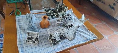 Arredi in resina bellissimi che mi sono costati una fucilata: due relitti di navi, uno di aereo, uno scrigno del tesoro, due pietre levigate