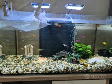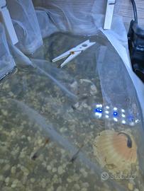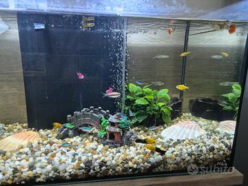 vendo acquario completo di tutto come in foto ( tranne mobiletto). la rete con mollette è provvisorio solo per i piccoli ( 6 guppi)