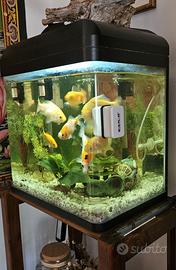 Completo di filtro, ricambio filtro, ambientazione come da foto, spazzola vetro e mangime. Se volete, con anche con i 7 pesci rossi. Misure L38xP26xH44, 30l.