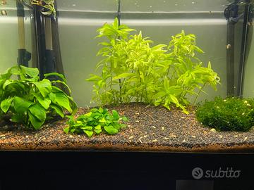vendo acquario acqua dolce, ancora funzionante, con piante, un gamberetto, e un pesciolino. pompa con filtro e riscaldamento esterno. vendo con mobiletto incluso.