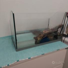 Vendo acquario per tartarughe. In ottimo stato come si vede in foto. Dotato anche di fontanella per ricircolo acqua. Misure: Lunghezza 60cm, Larghezza 30cm, Altezza parte alta 35cm, Altezza parte bassa 25cm.