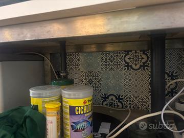 Per cambio progetto vendo acquario bellissimo con sump. Anticipo che in totale ho speso 5000€ quindi no offerte assurde… Se interessati invio video in privato per vederlo allestito e funzionante. Misure vasca 215Lx60Px60H… vetri doppi 150mm… quasi 800 litri lordi. La vasca vuota pesa 2 quintali. Allestimento iniziale marino mediterraneo poi cambiato in amazzonico pertanto si cede con grandi tronchi e terriccio di ghiaia nera. Vasca aperta a giorno (io avevo un telaio retato con potos) 4 lampade orientabili da 6500k 25w Vasca sump di 70 litri circa con pompa Sycce e 3 riscaldatori e termostato esterno eliwell. Struttura a telaio su misura interamente in acciaio inox (come vedete dalle foto e stato pannellato con struttura in legno rivestita da mattonelle). Top in legno da 5cm dove e poggiata la vasca. Il banco frigo in foto si toglie e potete anche creare un mobile con ripiano e stipi. La struttura é presente in un ristorante come elemento di arredo. Il prezzo della sola vasca comprensiva di sump é di 500€ Il prezzo degli arredi interni (terriccio e tronchi) é di 200€ Il prezzo degli elementi riscaldanti, pompa, ossigenatore, termostato e lampade é di 200€ Il prezzo della struttura in acciaio inox completa di top in legno é di 400€ Il prezzo del banco refrigerato per esposizione del pesce é di 500€ Vendo in blocco ad €1000 (senza banco pescheria).