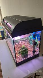 vendo acquario completo misura 50 x 35... incluso tutto l allestimento come in foto con una pianta vera e una finta e due pesci scalari di cui uno koi... incluso aeratore filtro e riscaldatore e coperchio con lampada specifica per pesci incassata....