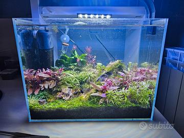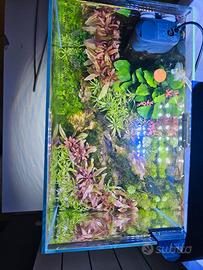 Vendo acquario di dimensioni 40x25x30 circa, ottimo, per esempio, per un pesce combattente(betta). È provvisto di filtro, impianto di erogazione CO2(con bombola carica circa al 50%) e 2 lampade Al momento è completamente piantumato e abitato da neocaridine(di colore verde, giallo, qualcuna blu scuro e molte colore naturale) È possibile rimuovere tutta la parte estetica/piante ma NON è possibile rimuovere le neocaridine. Inoltre è possibile acquistare singolarmente la vasca. NON vendo impianto co2 singolarmente
