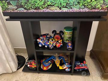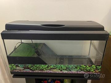 Acquario con isola per tartaruga in perfetto stato, completo di luce neon, motorino per circolo dell'acqua e mobile abbinato. Misure acquario: 80x40x30cm (LxHxP) Misure mobile: 80x66x30cm Gadget Disney non inclusi.