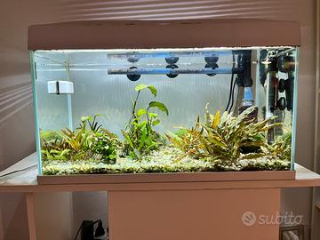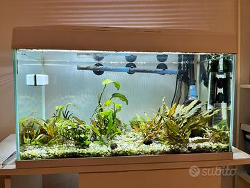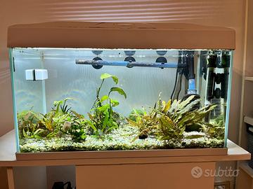 Acquario completo di tutto, come si vede in foto, con varie specie di piante vere, qualche caridina e lumaca, filtro gia’ avviato, pronto per l’inserimento dei pesci (unica cosa da acquistare separatamente). Misura 58X30x35 cm, 60 litri netti. Filtro esterno Tetra sovradimensionato in perfette condizioni, perfettamente funzionante, guarnizioni in ottimo stato, di un anno di vita. Disponibile con o senza mobile a supporto. Acquario completo di piante vere, filtro, illuminazione, riscaldatore, calamita pulizia vetro e diversi mangimi : 120 Euro. Vetro in ottime condizioni, senza graffi. Siliconature perfette.