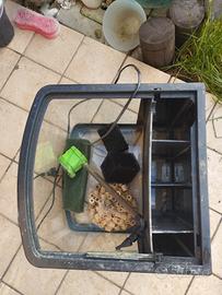 acquario da 26 litri, dimensioni comprese di coperchio: lunghezza 32cm, larghezza 31cm, altezza 33. Acquario compreso di filtro e luce.