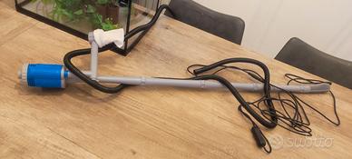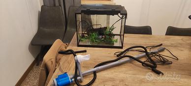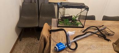 Acquario con piante artificiali e depuratore oltre a uno strumento per la pulizia dell'Acquario cioè un pulitore elettrico