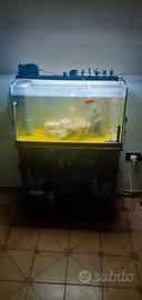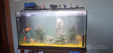 Filtro interno compreso di termostato, la scarpetta a tre spine per il funzionamento contemporaneo del filtro,pompa aria e luce a LED notte o giorno con interruttore diretto sul filo,spugna e cannolicchi, fondo acquario in pietrisco giallo facile da pulire con pompa manuale, pietrisco vario di colore rosso chiaro,marrone e nero, luce a LED notte e giorno di 60 cm dal valore di 70 euro, pompa per l'ossigenazione e vari accessori non in foto come dinosauri, città del vecchio West con vari recinti, vari pezzi di montagne, set completo di spongebob pagato 30 euro ed altro ancora per variare spesso gli accessoriall'interno dell'acquario quando si cambia l'acqua è si fa pulizia...