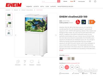 Vendo acquario Eheim Vivaline LED 150, uno degli ultimi modelli della serie, in condizioni pari al nuovo. L’acquario ha dimensioni 50 × 60 × 50 cm per una capacità di circa 150 litri ed è dotato di illuminazione LED originale. È di colore bianco ed è venduto insieme al mobile originale Eheim coordinato. L’acquario è in perfette condizioni, senza perdite né difetti, come visibile dalle foto. Nel prezzo sono inclusi anche: •Filtro adatto alla portata dell’acquario •Riscaldatore •Accessori vari •Pietre e legni per l’allestimento L’acquario viene quindi venduto completo e pronto per essere avviato.
