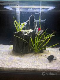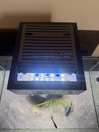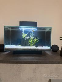 Acquario tenuto molto bene nessuna imperfezione, 44 x 40 x 54, filtro a zainetto integrato e luce con due modalità integrato caratterizzato dal vetro che copre la parte superiore rendendolo “ tridimensionale ”