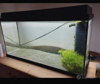 al momento l'acquario è in funzione con lumachine e muschi, con spugne del filtro mature ma da sostituire in quanto abbastanza vecchie (sono due spugne e uno strato di lanugine bianca). L'acquario può essere venduto vuoto o con fondo di quarzo nero di grana media oppure con quarzo avorio grana fine... Disponibili rocce Dragon Stone, piante galleggianti, muschio e pesci Endler (Poecilia wingei).