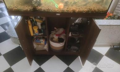 Completo di ogni accessorio, mangiatoia elettrica e programmabile, retini, pinze, prodotti vari per dolce e marino, accessori vari per diversi allestimenti, illuminazione a led aggiuntiva oltre a quella originale a tubi, coperchi originali, sabbia e fondi , lana di vetro, test acqua dolce e marino , schiumatoio, pompe interne ed esterne e tanto altro materiale.