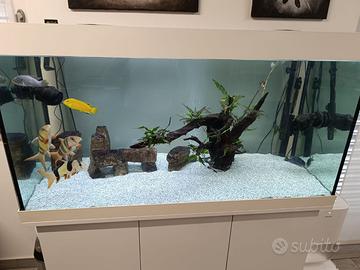 Dotato di filtro esterno, Askoll Pratiko 400 3.0 supersilent, lampada UV Eheim UV500, ossigenatore Tetra APS 300, riscaldatore Askoll 300 W, ventole raffreddamento acqua per il periodo estivo Protemp Cooler X300, 2 ventole movimento acqua Hydor Koralia Smart Wave, misuratore di PH fisso, termometro digitale + altri di ricambio, radice di mangrovia, piante, sassi non calcarei, sabbia (14 sacchi da 5 kg mista bianca/nera), pompa elettrica pulizia fondale Newa PGR2000, oltre a: