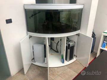 Vendo acquario angolare Juwel Trigon 350 da 350 litri, con vetro frontale curvo e mobile coordinato bianco, perfetto per arredare con stile qualsiasi ambiente. Le dimensioni (87 x 87 x 65 cm vasca + 80 cm mobile) lo rendono ideale per essere posizionato in un angolo, garantendo capienza, visibilità e impatto estetico.