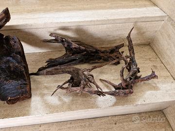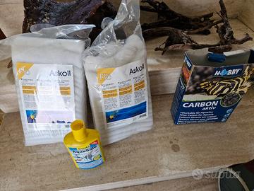 accessori per acquario utilizzati con pesci acqua dolce radiche legno, mangiatoia automatica, panno filtri , 500 grammi carboni attivi, liquido per depurazione acqua e 20kg di roccia granulare per fondo.