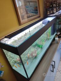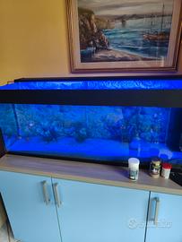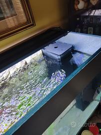 acquario artigianale, misure 130/35/50... filtro interno della juwel.. sfondo 3d sempre della juwel.. plafoniera led con luci bianche e blu per doppia illuminazione...lo do così come in foto...