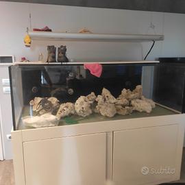 Vendesi acquario marino dimensioni 180x105x0.70h litri 1200.00, con sottostante mobile colore bianco vetri antiriflesso da 2.5 cm. luce T5 e led programmabile per giorno notte, alba tramonto e fasi lunari. Completo di schimner deposito per cambio d' acqua ... sistema di ricircolo e rabbocco. Sistema di riscaldamento, sassi inclusi oltre 50 kg. Usato pochissimo 2 anni. attualmente non in uso per perdita d' interesse . Skimmer bouble king Pompa risalita da 1700 l/h royal esclusive Gestione acquatrinica a 6 sponde per minerali Samp 100 litri vasca. Vasca 150 litri per acqua depurata per rabbocco automatico Mobile in legno nautico con scheletro in ferro verniciato a polveri PER INFORMAZIONI WHAT UP AL 3407163950. RITIRO A CARICO ACQUIRENTE .