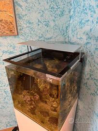 Vendo acquario marino completo in Friuli Venezia Giulia, composta da: - acquario blau panoramic 91 litri preso a settembre 2024 misura 45X45X45 con mobile bianco di supporto che misura 45x45x80h con sump a scomparti 37x37x40h 50L con scomparto per skimmer, pompa di risalita e rabbocco - Pompa di risalita della sicce Syncra silent 1,5 acquista il giugno 2025 - lampada per acquario marino, Micmol Airpro 450 marine acquistata ad ottobre 2024. - Ventola di raffreddamento cooling fan della ista presa a giugno 2025 - Skimmer Tornado 120 della mantis comprato gennaio 2025, - pompa di movimento TMC Reef flow 2.0 1000 nano comprata ottobre 2024 - Rete anti salto Foto rappresentativa coralli e rocce non sono in vendita.