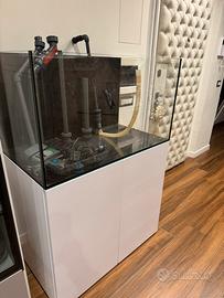 Acquario marino tropical nature Reef habitat 90 bianco lucido, perfetto da mettere in salotto Perfette condizioni (anche se con qualche piccolo graffio superficiale) Dimensioni: 90x50x50h cm (altezza totale 130 cm con supporto) Capacita toale circa 270 litri 188L vasca, 81L sump, 15L riserva Vetro ultra trasparente Mobile finitura bianco lucido Chiusure push-to-open, cerniere soft close Design minimalista senza montanti