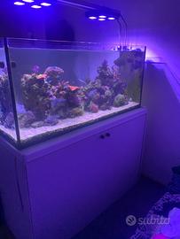 L’acquario è messo in finzione un anno fa, l’acquario in vetro è nuovo con siliconature nere, pompe di movimento nuove completamente regolabili sia in ora di accensione che di flusso, plafoniere perfettamente funzionanti modello mitras lx7 perfette per coralli anche esigenti, mobile in ferro con un anno di vita tutto pannellato in legno verniciato con vernice apposta di bianco, con calamite per attaccare e staccare i panelli, dosometrica jebao 4 canali, balling ATI, rabbocco automatico dell’acqua, vari accesori per manutenzione pulizia del vetro ecc,