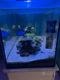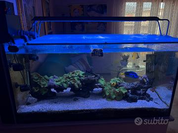 Vendo splendido acquario marino artigianale, tenuto in perfetto stato e attualmente in funzione. Il sistema è completo di tutto il necessario: tecnica, pesci, coralli e fondo. Un ecosistema maturo, ideale per chi cerca un pezzo d'arredamento vivo senza dover attendere i tempi di maturazione. Caratteristiche Principali • Vasca: Artigianale, misure 110x46x55 cm. • Capacità: 235 litri netti. • Allestimento: Rocce vive di alta qualità, sabbia corallina e vari coralli. Componenti Tecnici • Schiumatoio: Deltec MCE 600 (una garanzia di efficienza e silenziosità). • Illuminazione: Plafoniera Maxspect. • Nota: Il controller è guasto, pertanto la lampada funziona costantemente alla massima potenza (ottima per la crescita dei coralli). Popolazione (Pesci inclusi) L'acquario ospita esemplari sani e ben adattati: • 1 Pesce Chirurgo (Acanthurus) • 2 Angeli Nani (Centropyge) • 1 Pesce Pagliaccio • 1 Forcipiger flavissimus (Pesce Farfalla Giallo) Condizioni di Vendita • Prezzo: 1.000 € • Modalità: Vendita esclusivamente in blocco. • IMPORTANTE: Non vendo separatamente pesci, coralli o singole attrezzature. No perditempo o affaristi. Rispondo solo a persone realmente interessate all'acquisto del BLOCCO completo.