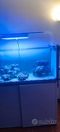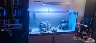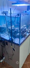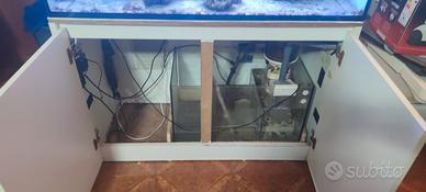 vendo acquario marino vasca con misure 120x55x55 con mobile e sump con vano di rabocco,la vasca è un acquario con vetri chiari,in più ci sono due atolli di rocce vive di almeno 10 kg per atollo , tutto il resto pompa di movimento pompa di risalita lampada supporto lampada e schiumato non è compreso nel prezzo